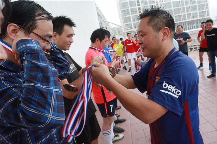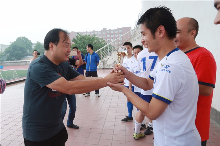 公司财务副总监、国祯环保足球队队长王祥宇为获奖队颁奖