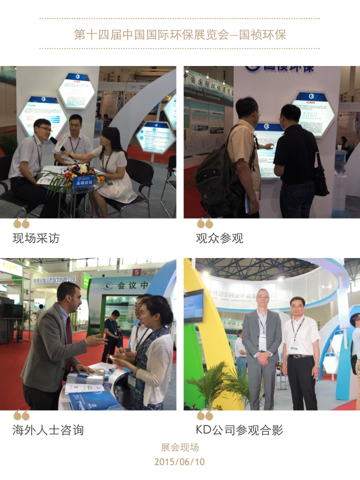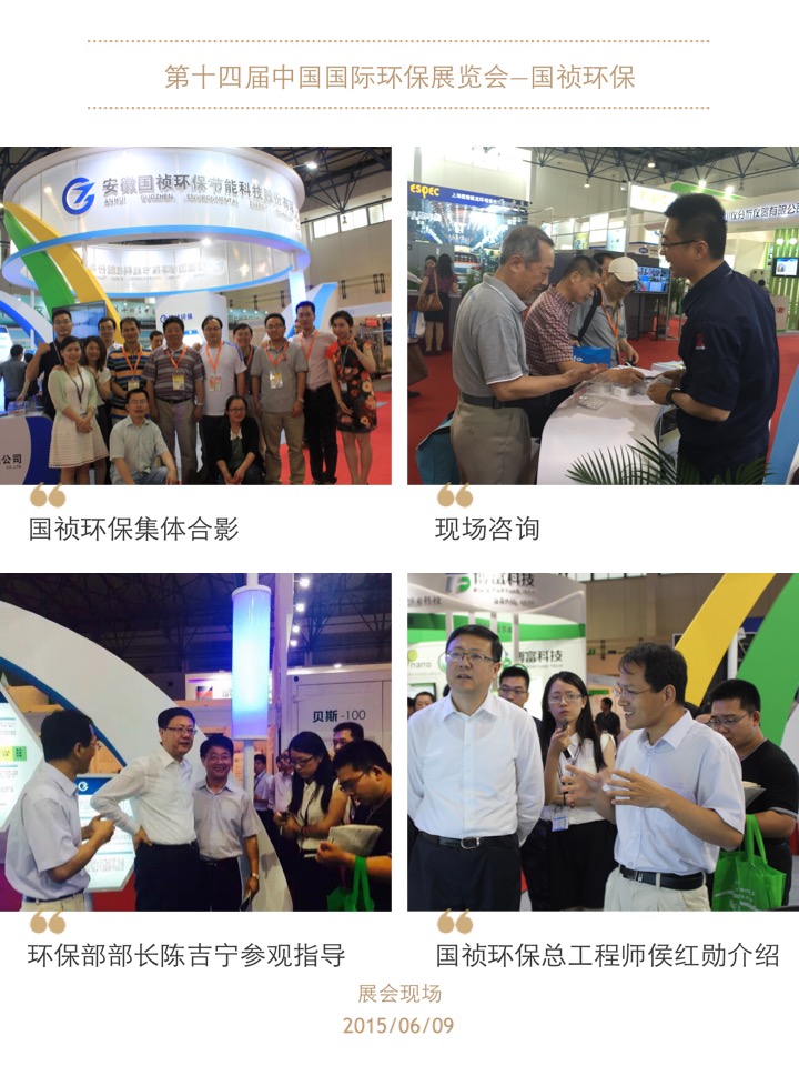 此次展会,国祯环保全方位展示公司业务领域,以全产业链的华丽姿态展现了公司发展的蓬勃生机,为环保界人士和广大观众带来一场不容错过的饕餮盛宴,受到观众和媒体的广泛关注。展会期间,国家环境保护部陈吉宁部长亲临国祯环保展厅参观指导,公司市场总监徐本勇、总工程师侯红勋陪同参观。展会期间,各事业部负责人从专业角度与观众进行深度交流、沟通、洽谈。现场还吸引了海外人士和媒体的关注,中国环保在线高端访谈对我司进行了现场采访和报道。