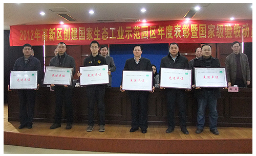12月25日上午10时,高新区创建国家生态工业示范园区年度表彰暨国家级验收动员会在国祯大厦多功能厅举行,高新区环保局董剑波局长宣读了高新区创建国家工业示范园区工作先进单位和个人,高新区经贸局、国祯环保等六家单位荣获高新区创建国家生态工业示范园创建工作先进单位称号。