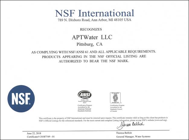 麦王环境美国全资子公司APTwater ARoNite技术获得NSF技术认证